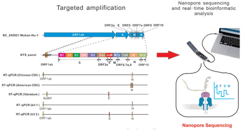 NTS技术特点在于:它不局限于中国或美国疾病控制中心目前在RT-qPCR方法中推荐的位点,而是将检测范围扩大到9个基因、12个位点近1万个碱基(10 kb)区域,全面覆盖病毒基因组上主要基因区域,100%覆盖病毒基因组上毒力相关的重要基因,从而显著提高检测敏感性和准确性;NTS技术采用靶向扩增方案,从而排除了大量非病毒核酸的干扰,提升检测效率;NTS技术采用可以同时测序同时分析的纳米孔测序,从而提升检测速度,并且能够通过读取病毒序列实现检测病毒突变及对病毒分型。
