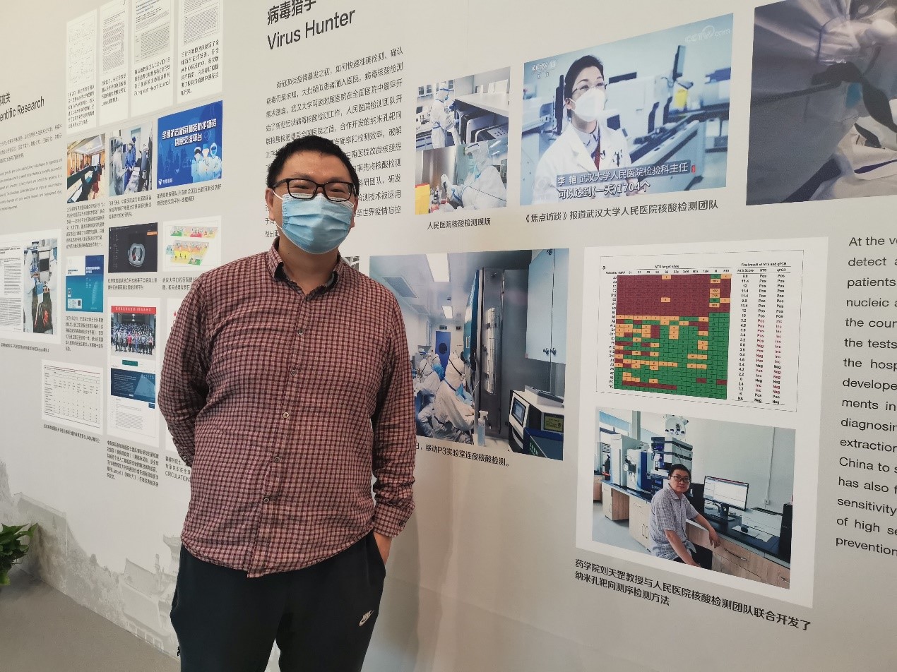 在这次疫情中,刘天罡教授与人民医院核酸检查团队将最前沿可靠的便携式纳米孔靶向测序技术引入到诊断检测中,实现精准分诊,在样本检测规范安全操作等方面也成为全省楷模,为打赢疫情防控阻击战提供了强大的智力支持和科技支撑。刘天罡教授作为学校科研战疫代表,他的先进事迹在特展中也展现出来了,作为疫情的见证者,他积极主动地当起了讲解员,全程带领师生参观,在部分展板前进行生动详细地解说。在“科技力量”单元重点介绍了“病毒猎手”bat365在线平台官网登录人民医院检验科李艳教授和bat365在线平台官网登录病毒学国家重点实验室蓝柯教授科研战疫中的重要贡献。