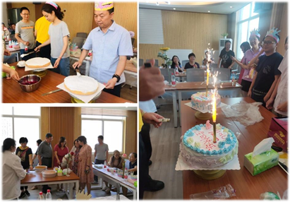 本次活动,学院工会还为生日在五月至九月之间25位老师举行了集体生日会。随着轻快的“祝你生日快乐”的音乐响起,寿星们带上了生日帽,大家跟随糕点师傅一起学习制作起了生日蛋糕。在老师们的共同努力下,两个漂亮的大蛋糕出现在大家的眼前。烟花蜡烛在大家的欢呼声中点燃,绚烂的小小烟花在蛋糕上盛开,照亮每个人脸上欢乐的笑容,温暖着每个人的心扉。