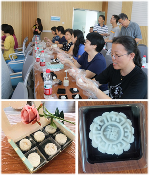 中秋节是我国的传统节日,人们往往以月之圆寓意人之团圆,寄托着对故乡、对家人的思念之情,自古更有赏月、吃月饼等习俗。本次活动,学院工会组织老师们一起动手学习制作了色香味俱全的月饼:先准备好可以做月饼饼皮的熟糯米以及莲蓉和豆沙两种馅料,然后糕点师傅们手把手教大家将馅料完美的包进饼皮内,形成如小包子一样的球状月饼雏形,紧接着将其放入塑型模具中用力挤压,瞧,一个印着“福”或者花瓣的小月饼就跃然而出。大家兴致盎然,其乐融融,每位老师此刻都沉浸在自己动手制作月饼的幸福中,最后用美丽的包装盒封装好,带回家同亲人分享。