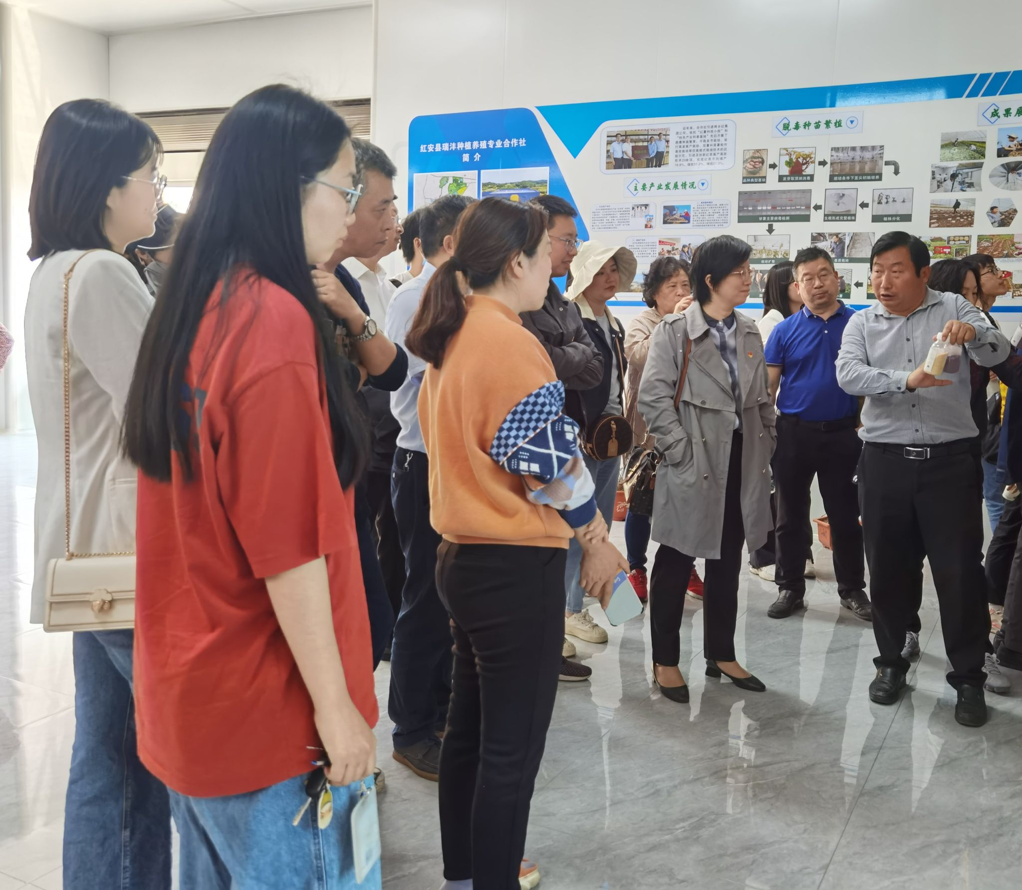 在参观杏花乡龙潭寺村瑞沣种植养殖专业合作社时,全国脱贫攻坚先进个人、合作社理事长姚峰,为我们介绍了合作社坚持科技兴农、产业为农之路,发展特色优势产业,带领村民走上一条通向富裕文明的康庄道。在自古以来生长在乡村田田畈畈、冲冲洼洼里的小小红薯上作大文章,依托“红薯科技小院”和“特色产业科普基地”,与省内多家高校合作,开展双薯种苗繁育、高产栽培、高效轮作等优高模式栽培技术的试验示范,把实验室的研究成果转化成农民田间丰收的硕果,让往日耐以果腹的忆苦饭变成餐桌上的美味佳肴,把课堂上的理论知识变成助农增产丰收的干货和脱贫致富的法宝。