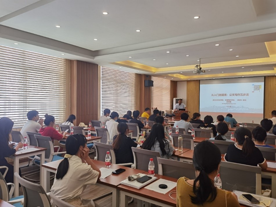 宋时磊老师作题为《从入门到提高:公文写作五步法》的专题讲座。宋老师结合多年从事文字综合工作的经验,用丰富的理论知识,生动的案例,深入浅出地讲解了公文写作规范和要求,讲授中既有格式规范剖析,又有实际操作演练;既有处理技巧指导,又有易犯错误示例,讲解清晰,语言幽默,明了易懂。