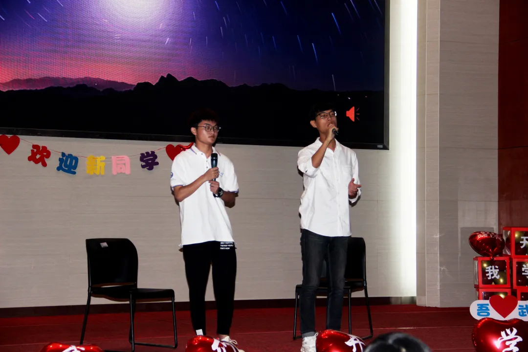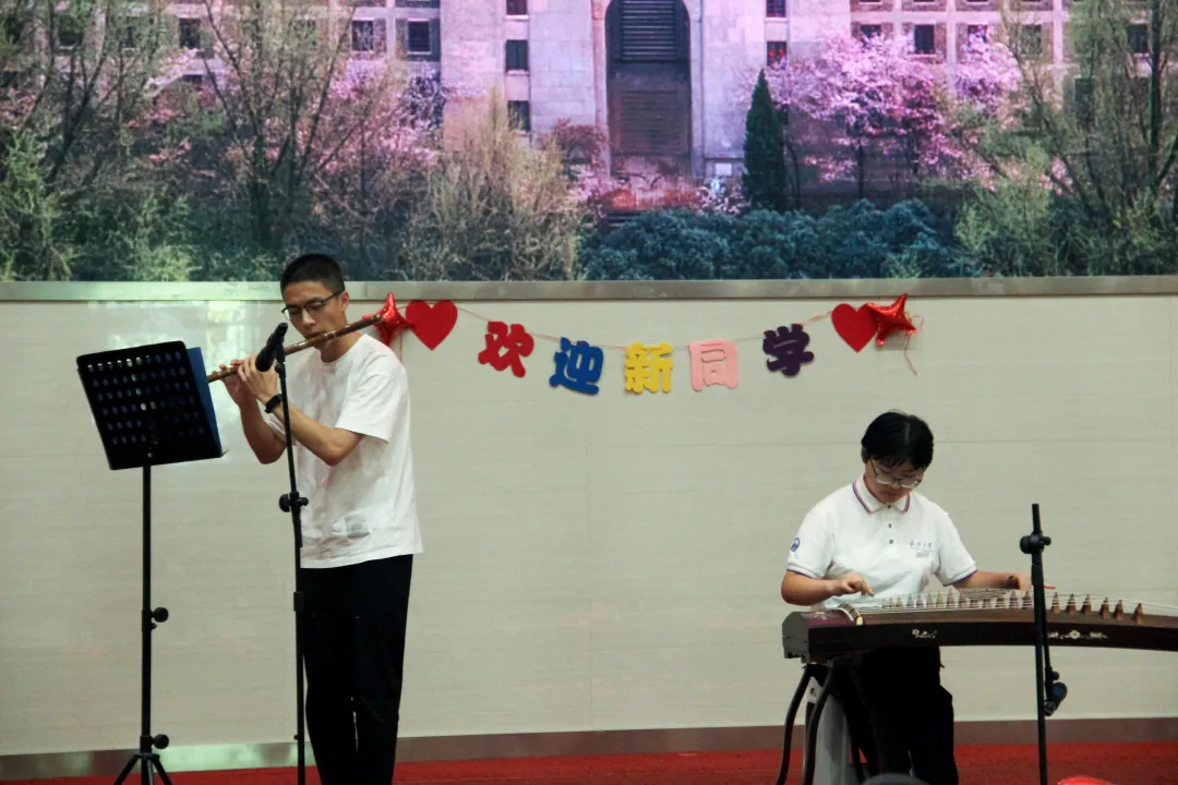 在新生才艺表演环节,本科生新生范宇航与研究生新生彭磊倾情献唱《永不失联的爱》,本科新生张雪儿与笛箫协会赵思屹为大家带来了笛筝合奏《金蛇狂舞》。为欢迎会增添了热烈、欢快的气氛。