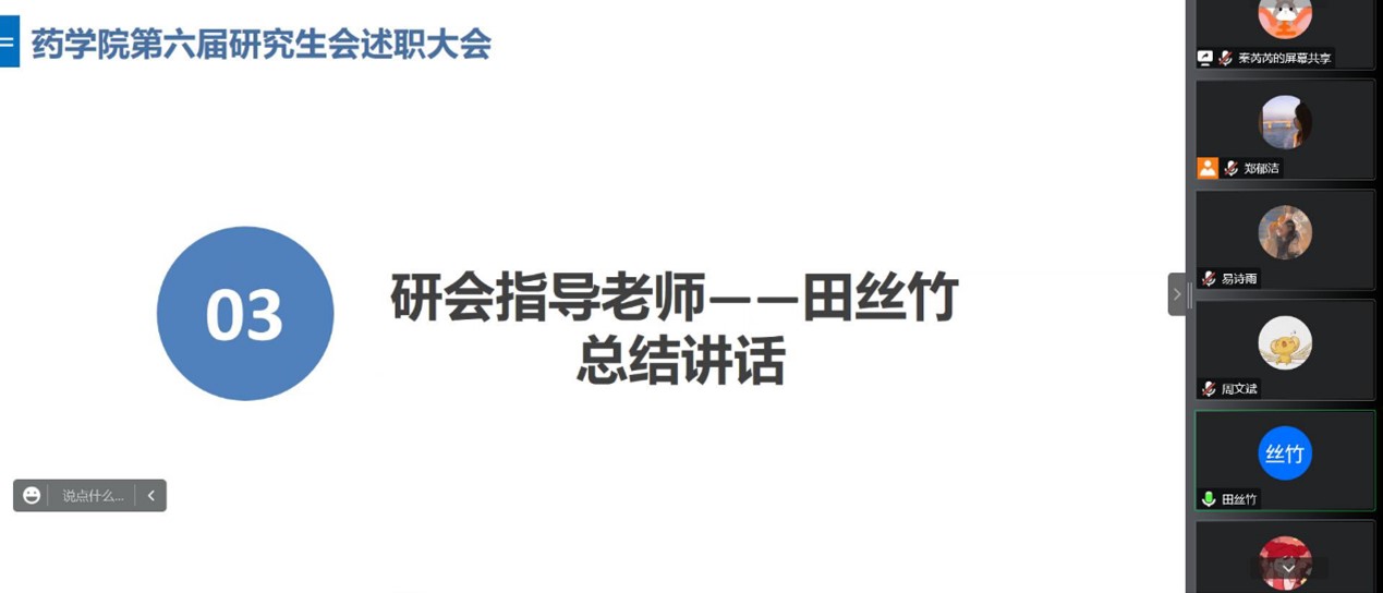 随后,研会指导老师田丝竹老师对本次述职大会进行了总结,田丝竹老师肯定了本届研究生会各部门这一年来的工作,各部门各司其职又相互合作,对所有研究生会成员这一年的辛苦付出表示了感谢。同时田丝竹老师也对研究生会的工作提出了一些建议和展望,期待研究生会不忘初心、砥砺前行。