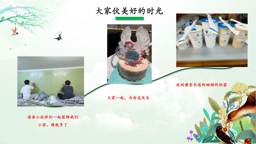 为拉进寝室同学间的关系,丰富大学生校园生活,学院举办了为期两周的寝室风采大赛活动。活动分为寝室卫生检查、人气寝室评比和寝室默契比拼三部分,辅导员定期对新生们的寝室卫生情况、寝室文化建设进行评比打分;通过线上评比,同学们充分展示寝室特色来提升人气;默契比拼环节则通过多种游戏竞赛促进寝室间友好关系的形成。